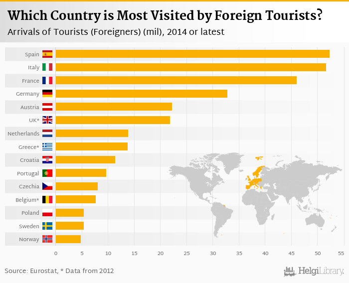 Based on a comparison of 34 countries in 2014, Spain ranked the highest in arrivals of foreign tourists with 52.4 mil followed by Italy and France. On the other end of the scale was Liechtenstein with 0.060 mil, Macedonia with 0.395 mil and Serbia with 0.976 mil.
