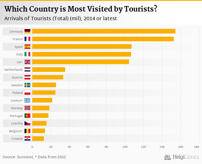Based on a comparison of 34 countries in 2014, Germany ranked the highest in arrivals of tourists with 155 mil followed by France and Spain. On the other end of the scale was Liechtenstein with 0.061 mil, Macedonia with 0.595 mil and Luxembourg with 1.14 mil.