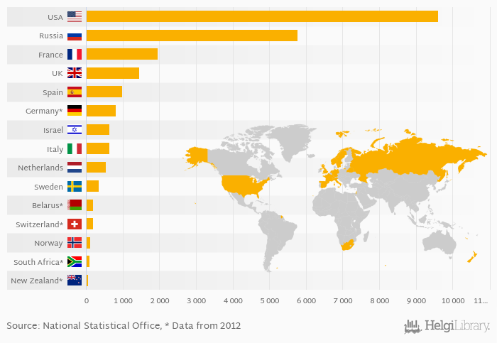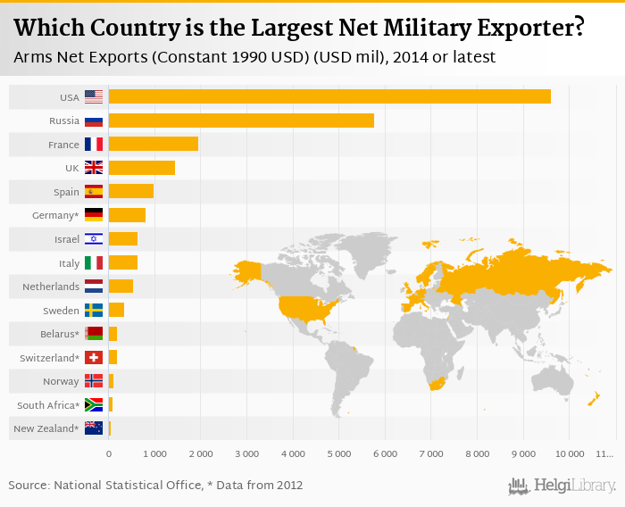 Based on a comparison of 42 countries in 2014, USA ranked the highest in net arms exports at constant USD prices from 1990 with USD 9,613 mil followed by Russia and France. On the other end of the scale was India with USD -4,188 mil, Turkey with USD -1,276 mil and United Arab Emirates with USD -1,029 mil.