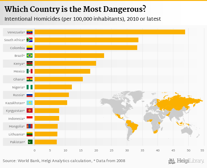Based on a comparison of 78 countries in 2010, Venezuela ranked the highest in intentional homicides per 100,000 inhabitants with 49.0 followed by South Africa and Colombia. On the other end of the scale was Iceland with 0.300, Singapore with 0.500 and Japan with 0.500.