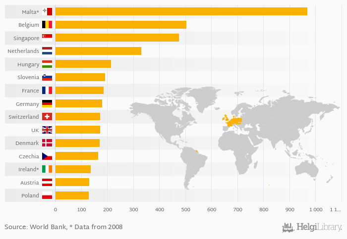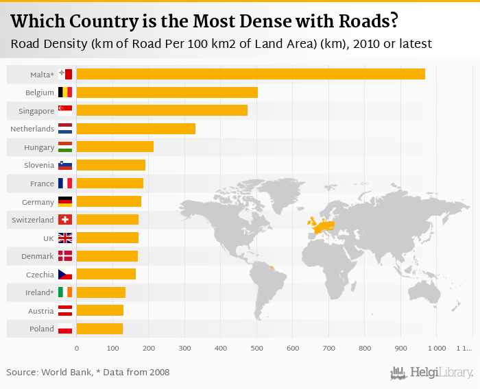 Based on a comparison of 65 countries in 2010, Malta ranked the highest in road density measured by km of road per 100 km2 of land area with 968 km followed by Belgium and Singapore. On the other end of the scale was Mongolia with 0.717 km, Kazakhstan with 3.52 km and Algeria with 4.77 km.