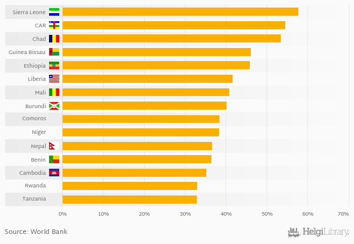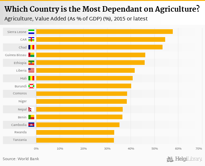 Based on a comparison of 158 countries in 2015, Sierra Leone ranked the highest in value added of agriculture as a share of GDP with 57.8% followed by Central African Republic and Chad. On the other end of the scale was Singapore with 0.036%, Hong Kong with 0.056% and Qatar with 0.094%.