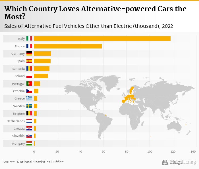 Based on a comparison of 30 countries in 2022, Italy ranked the highest in Sales of Alternative Fuel Vehicles Other than Electric with 118 thousand followed by France and Germany. On the other end of the scale was United Kingdom with 0 thousand, Ireland with 0 thousand and Cyprus with 0 thousand.
