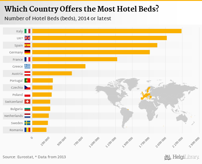 Based on a comparison of 35 countries in 2014, Italy ranked the highest in number of hotel beds with 2,241,240 beds followed by United Kingdom and Spain. On the other end of the scale was Liechtenstein with 1,288 beds, Luxembourg with 14,787 beds and Macedonia with 15,744 beds.