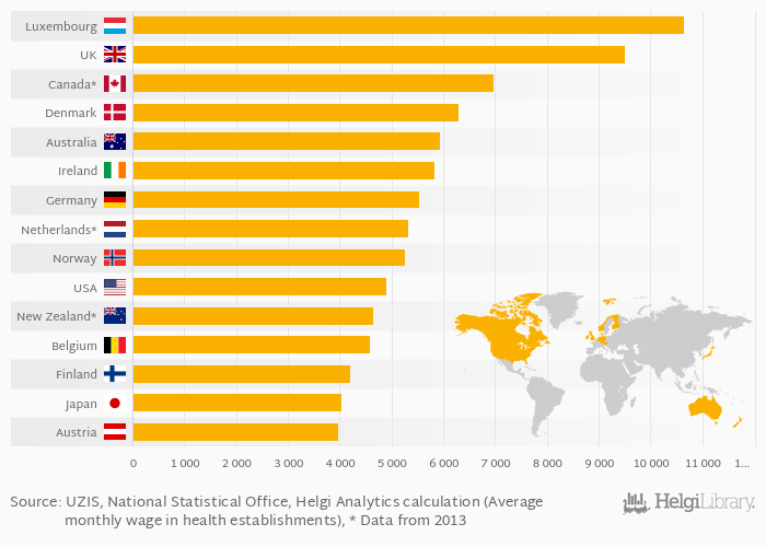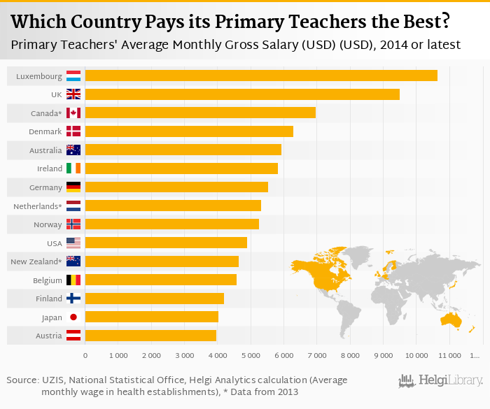 Based on a comparison of 35 countries in 2014, Luxembourg ranked the highest in primary teachers' average monthly gross salary with USD 10,648 followed by United Kingdom and Canada. On the other end of the scale was Latvia with USD 653, Hungary with USD 658 and Estonia with USD 861.