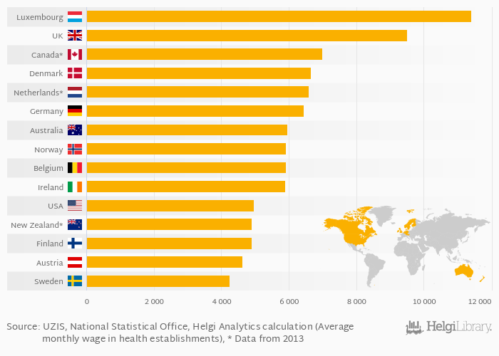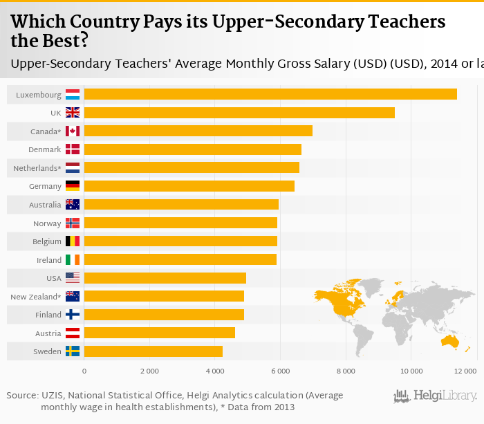 Based on a comparison of 34 countries in 2014, Luxembourg ranked the highest in upper-secondary teachers' average monthly gross salary with USD 11,401 followed by United Kingdom and Canada. On the other end of the scale was Latvia with USD 653, Hungary with USD 771 and Estonia with USD 861.