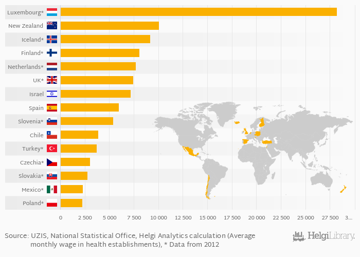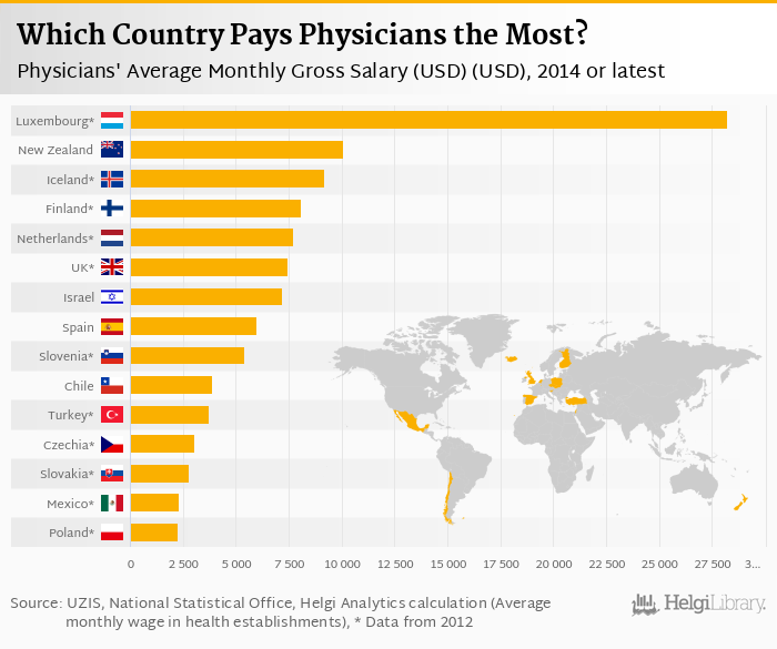 Based on a comparison of 17 countries in 2014, Luxembourg ranked the highest in physicians' average monthly gross salary with USD 28,196 followed by New Zealand and Iceland. On the other end of the scale was Hungary with USD 1,672, Estonia with USD 2,188 and Poland with USD 2,243.