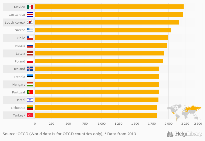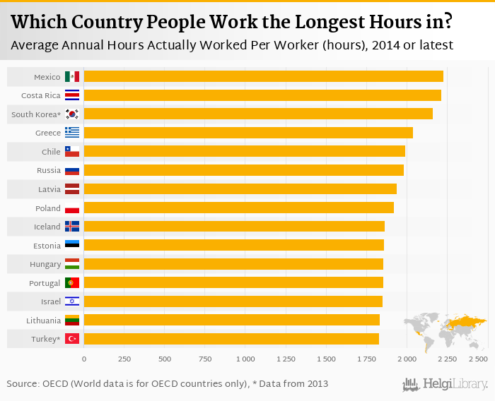 Based on a comparison of 38 countries in 2014, Mexico ranked the highest in Average Annual Hours Actually Worked Per Worker with 2,228 hours followed by Costa Rica and South Korea. On the other end of the scale was Germany with 1,371 hours, Netherlands with 1,425 hours and Norway with 1,427 hours.