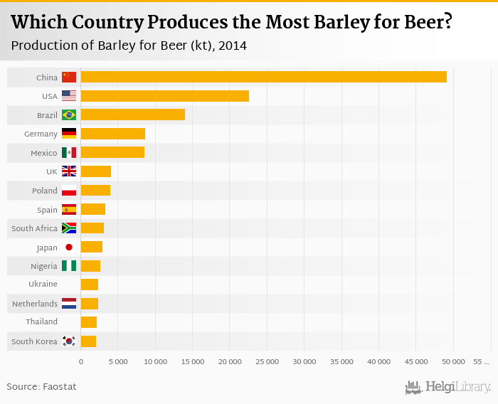 Based on a comparison of 148 countries in 2014, China ranked the highest in production of barley for beer with 49,219 kt followed by USA and Brazil. On the other end of the scale was Tajikistan with 0.110 kt, Guinea Bissau with 1.11 kt and Montenegro with 3.65 kt.