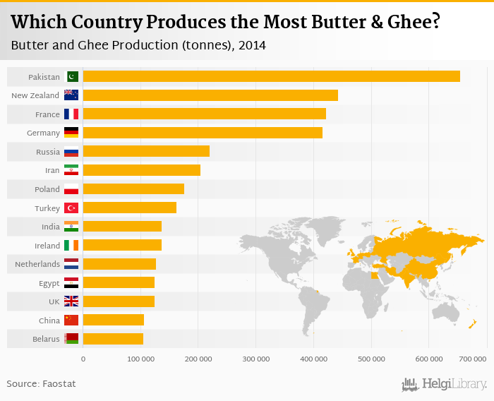 Based on a comparison of 119 countries in 2014, Pakistan ranked the highest in butter and ghee production with 655,113 tonnes followed by New Zealand and France. On the other end of the scale was Taiwan with 13.0 tonnes, Togo with 15.0 tonnes and Tajikistan with 17.8 tonnes.