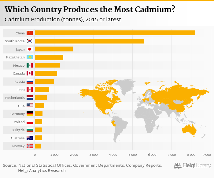 Based on a comparison of 20 countries in 2015, China ranked the highest in cadmium production with 8,200 tonnes followed by South Korea and Japan. On the other end of the scale was Argentina with 39.0 tonnes, Armenia with 40.0 tonnes and India with 69.0 tonnes.