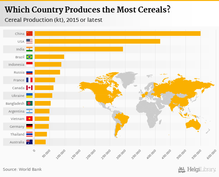 Based on a comparison of 167 countries in 2015, China ranked the highest in cereal production with 550,018 kt followed by USA and India. On the other end of the scale was Djibouti with 0.016 kt, Maldives with 0.188 kt and Puerto Rico with 0.618 kt.