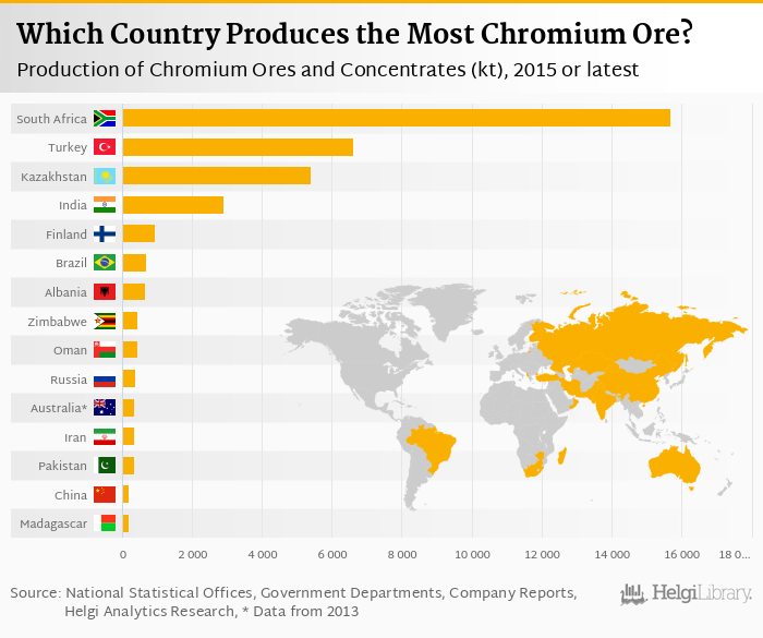 Based on a comparison of 20 countries in 2015, South Africa ranked the highest in production of chromium ores and concentrates with 15,684 kt followed by Turkey and Kazakhstan. On the other end of the scale was Afghanistan with 4.50 kt, Kosovo with 12.7 kt and Philippines with 15.5 kt.