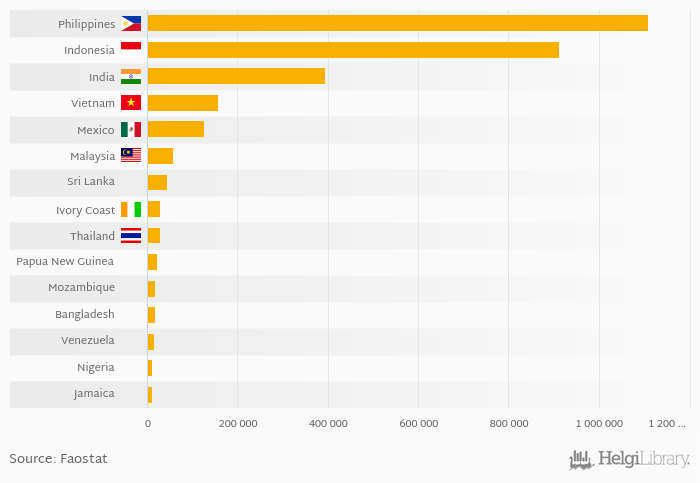 The top ranked country, Philippines, accounted for 34.1 % of coconut oil production in the world. The top 3 countries hold a 74.3 % share while the ten largest countries some 88.7 % in 2014.