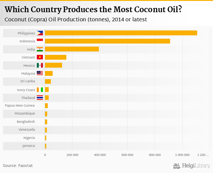 Based on a comparison of 58 countries in 2014, Philippines ranked the highest in coconut oil production with 1,109,112 tonnes followed by Indonesia and India. On the other end of the scale was Nepal with 0.620 tonnes, South Africa with 2.00 tonnes and Finland with 3.78 tonnes.