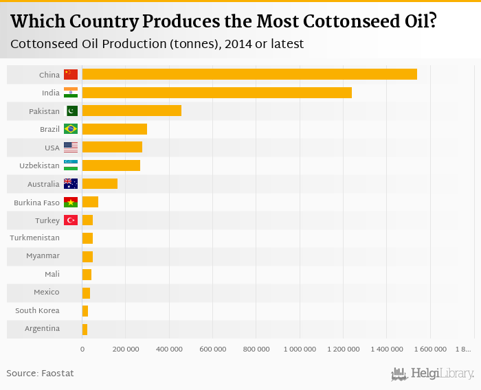 Based on a comparison of 92 countries in 2014, China ranked the highest in cottonseed oil production with 1,540,600 tonnes followed by India and Pakistan. On the other end of the scale was Uruguay with 1.00 tonnes, Romania with 2.00 tonnes and Poland with 2.00 tonnes.