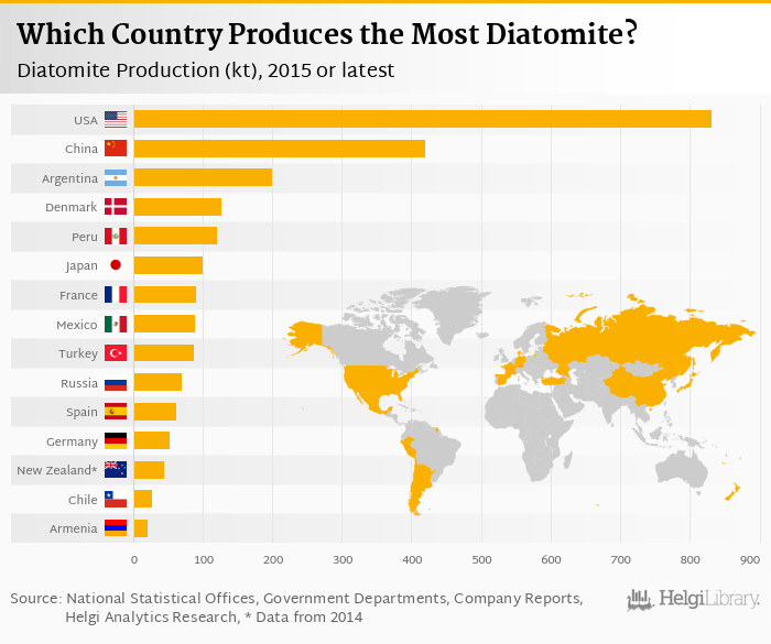 Based on a comparison of 29 countries in 2015, USA ranked the highest in diatomite production with 832 kt followed by China and Argentina. On the other end of the scale was Poland with 0.600 kt, Mozambique with 0.690 kt and Saudi Arabia with 1.00 kt.