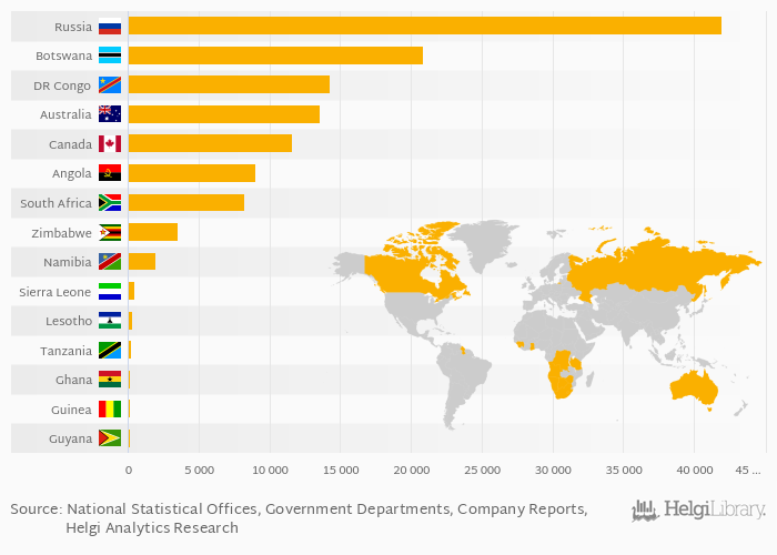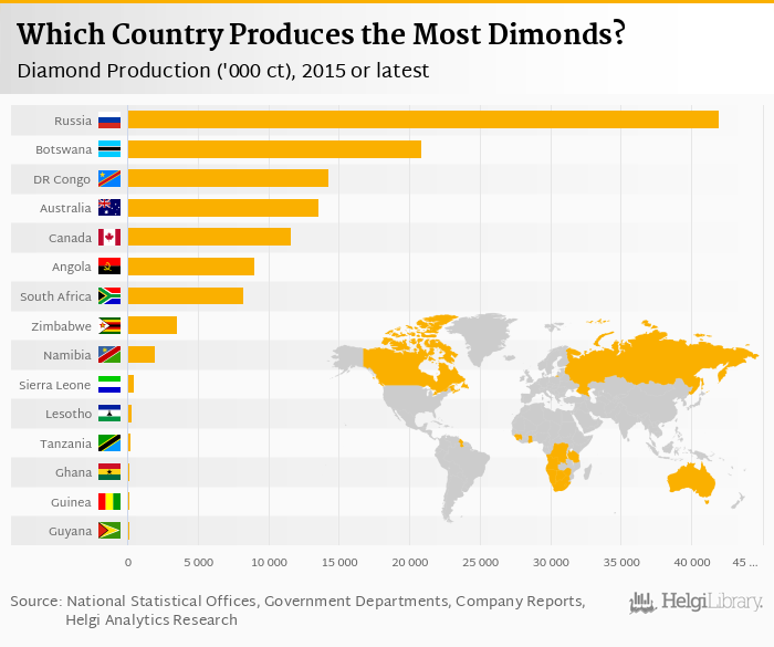 Based on a comparison of 23 countries in 2015, Russia ranked the highest in diamond production with 41,912 '000 ct followed by Botswana and Dem. Republic of the Congo. On the other end of the scale was Togo with 0.046 '000 ct, China with 1.05 '000 ct and Cameroon with 5.00 '000 ct.
