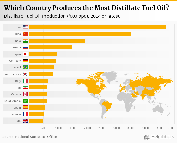 Based on a comparison of 111 countries in 2014, USA ranked the highest in distillate fuel oil production with 4,733 '000 bpd followed by China and India. On the other end of the scale was Belize with < 0.001 '000 bpd, Georgia with < 0.001 '000 bpd and Tajikistan with < 0.001 '000 bpd.