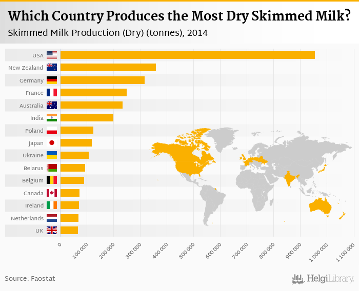 Based on a comparison of 55 countries in 2014, USA ranked the highest in dry skimmed milk production with 956,400 tonnes followed by New Zealand and Germany. On the other end of the scale was Moldova with 110 tonnes, Bosnia and Herzegovina with 150 tonnes and Honduras with 240 tonnes.