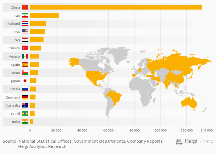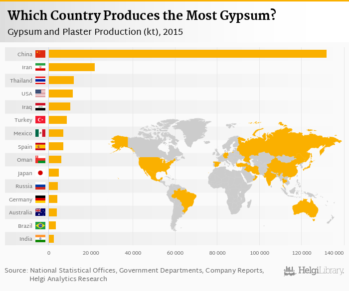 Based on a comparison of 84 countries in 2015, China ranked the highest in gypsum and plaster production with 132,000 kt followed by Iran and Thailand. On the other end of the scale was Madagascar with 0.130 kt, Niger with 0.253 kt and Sri Lanka with 0.600 kt.