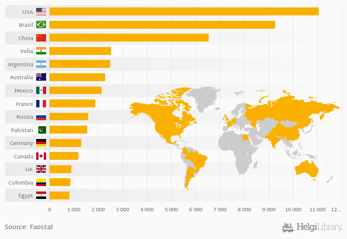 The top ranked country, USA, accounted for 16.7 % of indigenous cattle meat production in the world. The top 3 countries hold a 40.6 % share while the ten largest countries some 62.6 % in 2014.