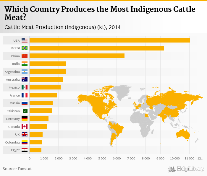 Based on a comparison of 171 countries in 2014, USA ranked the highest in indigenous cattle meat production with 11,057 kt followed by Brazil and China. On the other end of the scale was Macao with < 0.001 kt, Montenegro with 0.001 kt and Hong Kong with 0.001 kt.