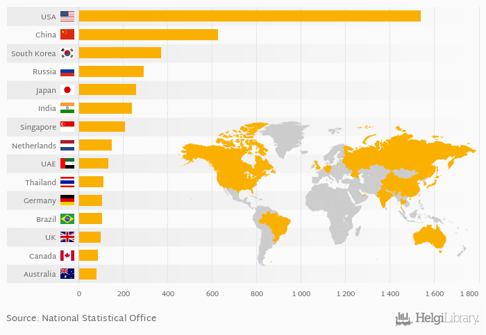 The top ranked country, USA, accounted for 26.1 % of jet fuel production in the world. The top 3 countries hold a 43.0 % share while the ten largest countries some 66.8 % in 2014.