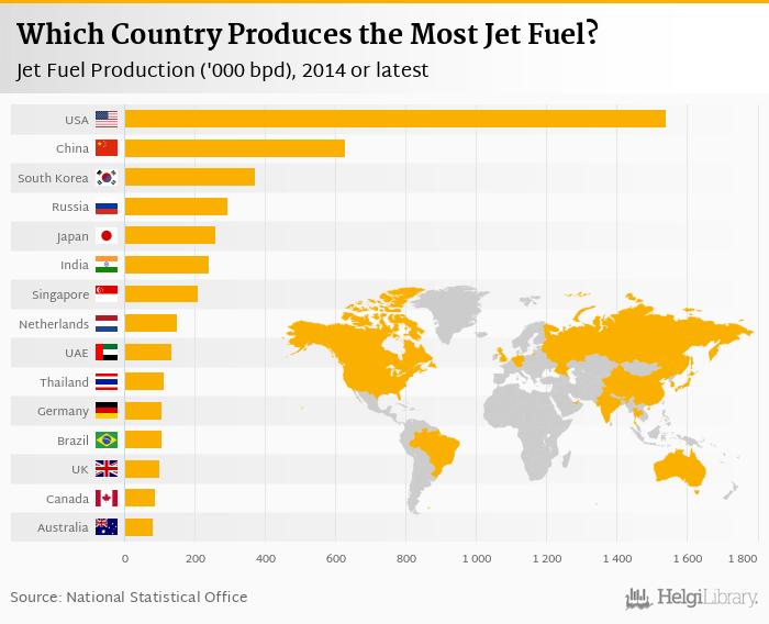 Based on a comparison of 98 countries in 2014, USA ranked the highest in jet fuel production with 1,541 '000 bpd followed by China and South Korea. On the other end of the scale was Bangladesh with 0.022 '000 bpd, Macedonia with 0.100 '000 bpd and Ghana with 0.196 '000 bpd.