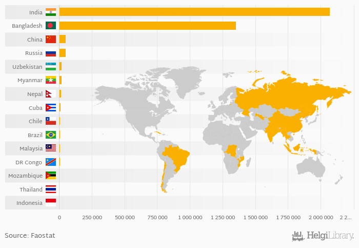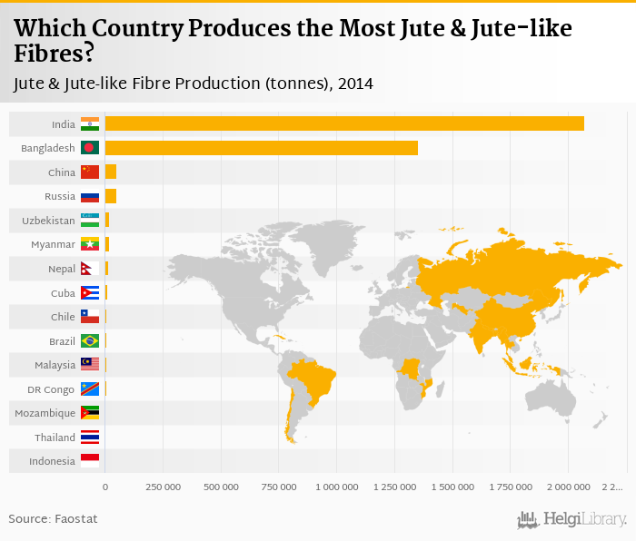 Based on a comparison of 34 countries in 2014, India ranked the highest in jute & jute-like fibre production with 2,071,412 tonnes followed by Bangladesh and China. On the other end of the scale was Cameroon with 99.0 tonnes, Central African Republic with 114 tonnes and Madagascar with 254 tonnes.