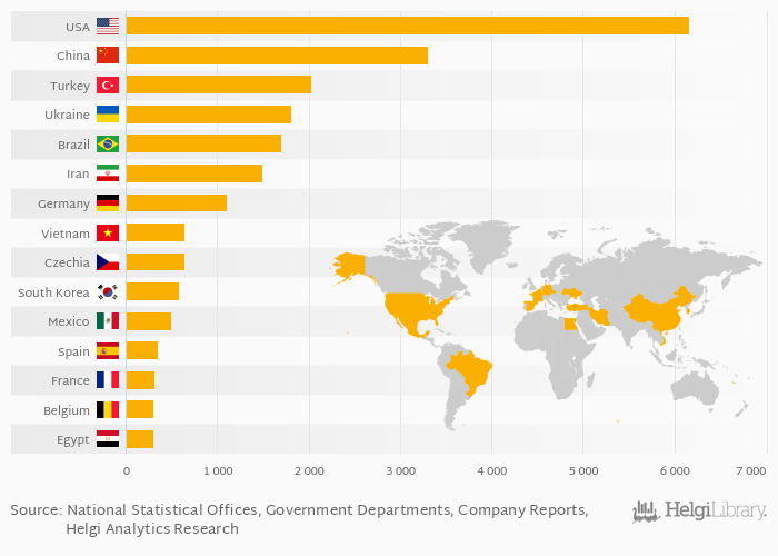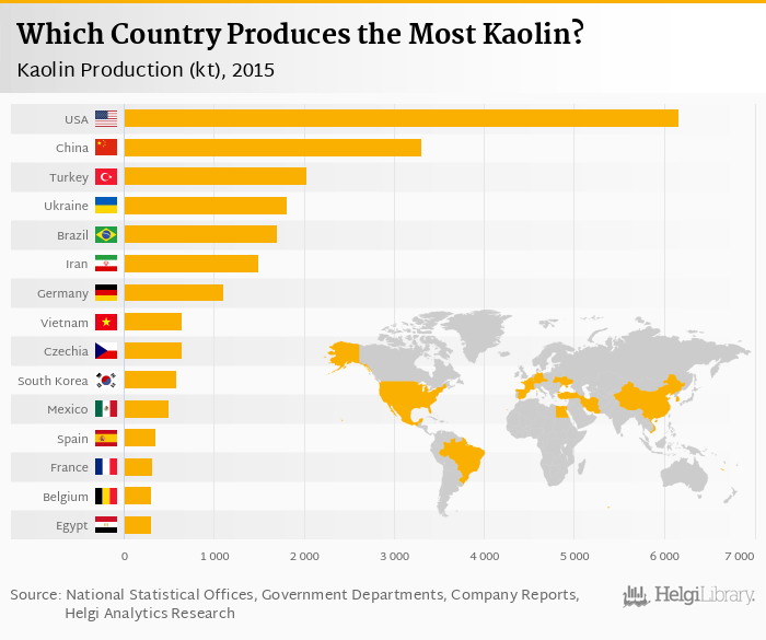 Based on a comparison of 58 countries in 2015, USA ranked the highest in kaolin production with 6,160 kt followed by China and Turkey. On the other end of the scale was Eritrea with 0.250 kt, Madagascar with 0.260 kt and Taiwan with 0.732 kt.