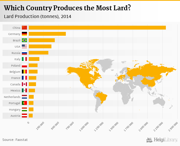 Based on a comparison of 79 countries in 2014, China ranked the highest in lard production with 2,310,425 tonnes followed by Germany and Brazil. On the other end of the scale was Morocco with 31.0 tonnes, Botswana with 38.0 tonnes and Estonia with 80.0 tonnes.