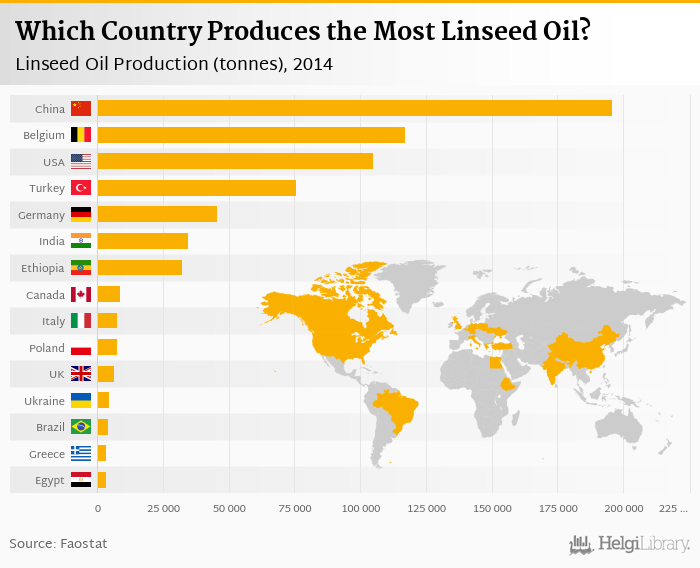 Based on a comparison of 59 countries in 2014, China ranked the highest in linseed oil production with 195,700 tonnes followed by Belgium and USA. On the other end of the scale was Jamaica with 6.00 tonnes, Mauritius with 9.00 tonnes and Latvia with 10.0 tonnes.