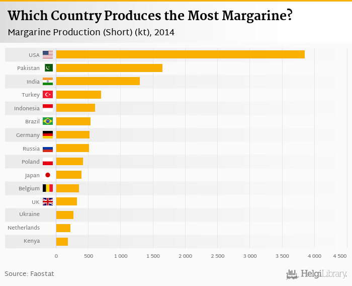 Based on a comparison of 86 countries in 2014, USA ranked the highest in margarine production with 3,856 kt followed by Pakistan and India. On the other end of the scale was Armenia with 0.016 kt, Bosnia and Herzegovina with 0.150 kt and Mozambique with 0.211 kt.