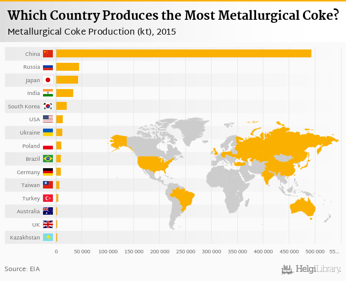 Based on a comparison of 40 countries in 2015, China ranked the highest in metallurgical coke production with 494,083 kt followed by Russia and Japan. On the other end of the scale was Mongolia with 79.0 kt, Pakistan with 89.0 kt and Dem. People's Republic of Korea with 191 kt.