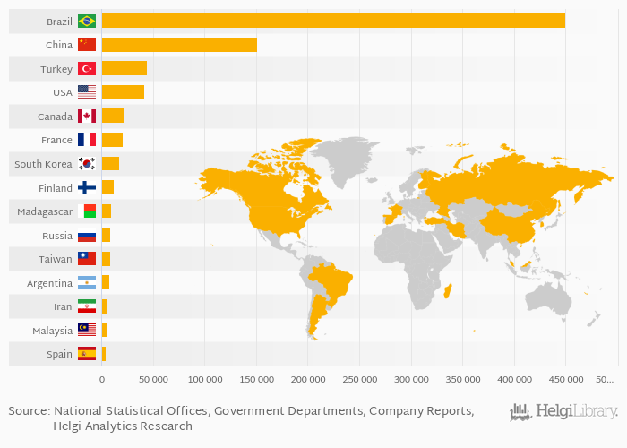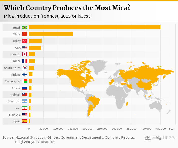 Based on a comparison of 21 countries in 2015, Brazil ranked the highest in mica production with 450,000 tonnes followed by China and Turkey. On the other end of the scale was South Africa with 29.0 tonnes, Egypt with 50.0 tonnes and Mexico with 160 tonnes.