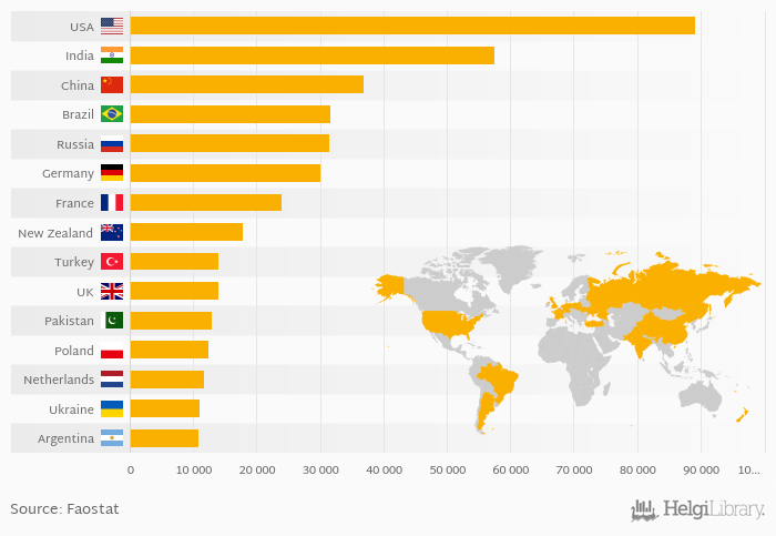The top ranked country, USA, accounted for 14.5 % of fresh cow milk production in the world. The top 3 countries hold a 29.9 % share while the ten largest countries some 56.5 % in 2014.
