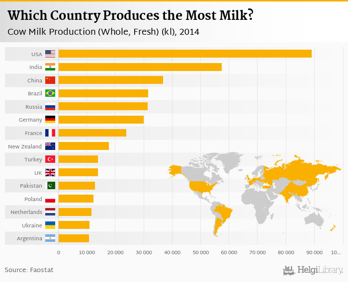 Based on a comparison of 170 countries in 2014, USA ranked the highest in fresh cow milk production with 89,118 kl followed by India and China. On the other end of the scale was Hong Kong with 0.004 kl, Seychelles with 0.022 kl and Brunei with 0.046 kl.
