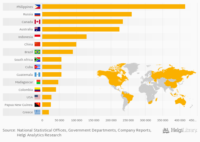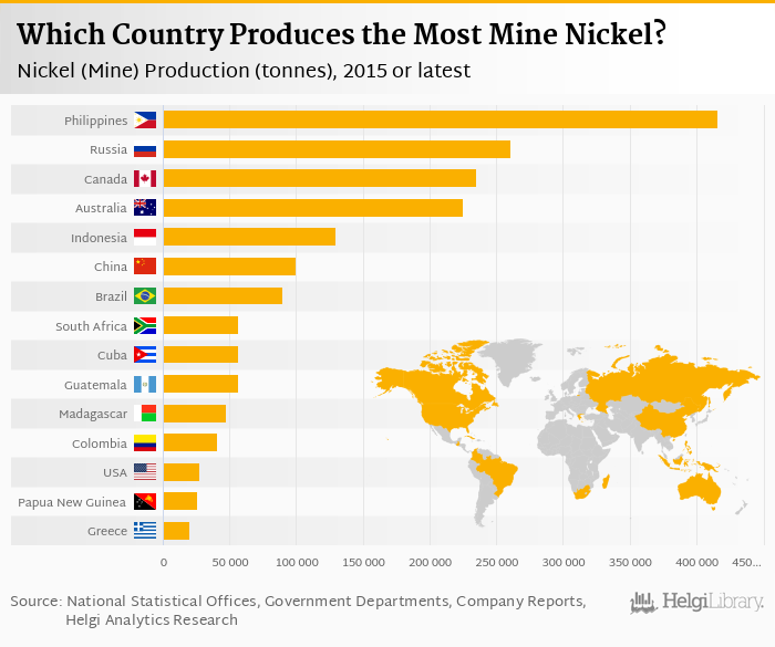 Based on a comparison of 28 countries in 2015, Philippines ranked the highest in nickel (mine) production with 416,019 tonnes followed by Russia and Canada. On the other end of the scale was Morocco with 160 tonnes, Norway with 300 tonnes and Poland with 840 tonnes.