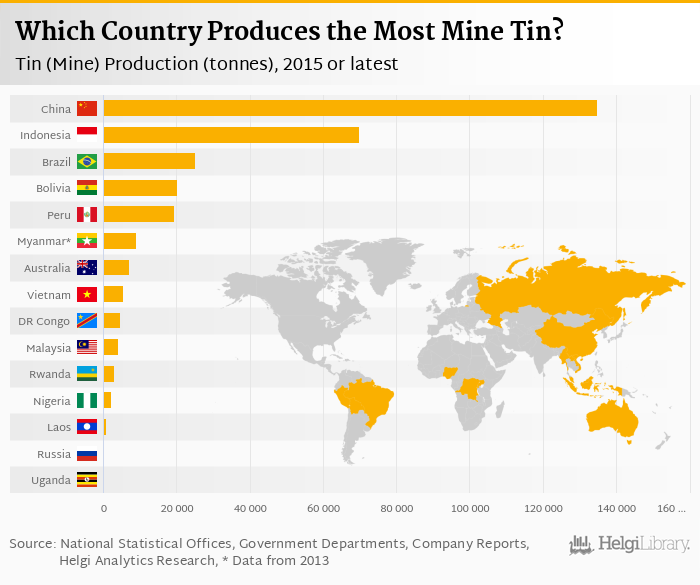 Based on a comparison of 23 countries in 2015, China ranked the highest in tin (mine) production with 135,000 tonnes followed by Indonesia and Brazil. On the other end of the scale was Mongolia with 3.00 tonnes, Egypt with 3.00 tonnes and Niger with 8.00 tonnes.
