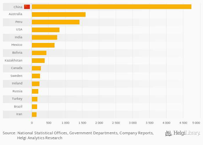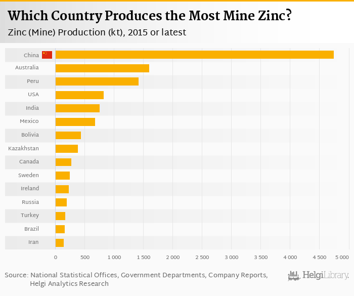 Based on a comparison of 50 countries in 2015, China ranked the highest in zinc (mine) production with 4,750 kt followed by Australia and Peru. On the other end of the scale was Slovakia with 0.200 kt, Laos with 2.00 kt and South Korea with 2.07 kt.