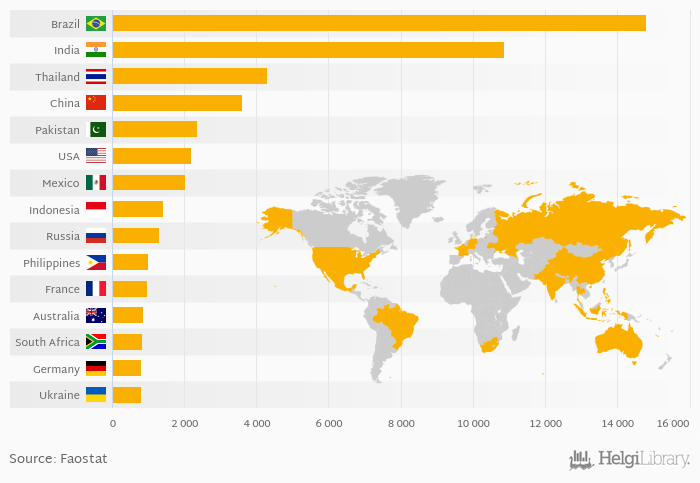 The top ranked country, Brazil, accounted for 24.2 % of molasses production in the world. The top 3 countries hold a 49.0 % share while the ten largest countries some 71.8 % in 2014.