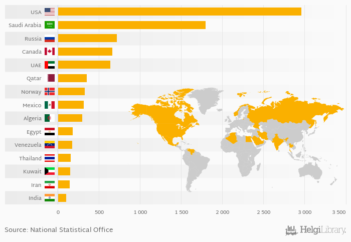 The top ranked country, USA, accounted for 29.6 % of natural gas liquids supply in the world. The top 3 countries hold a 54.8 % share while the ten largest countries some 82.6 % in 2014.