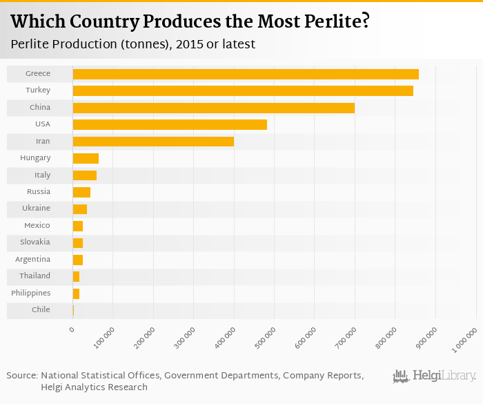 Based on a comparison of 18 countries in 2015, Greece ranked the highest in perlite production with 860,000 tonnes followed by Turkey and China. On the other end of the scale was Armenia with 14.0 tonnes, South Africa with 400 tonnes and Australia with 1,300 tonnes.