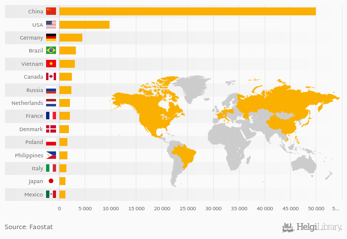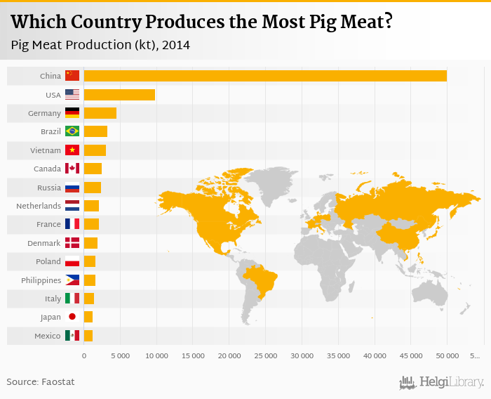 Based on a comparison of 150 countries in 2014, China ranked the highest in pig meat production with 49,953 kt followed by USA and Germany. On the other end of the scale was Singapore with < 0.001 kt, Macao with < 0.001 kt and Brunei with 0.045 kt.