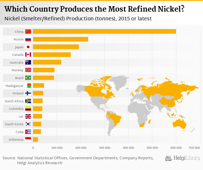 Based on a comparison of 27 countries in 2015, China ranked the highest in nickel (smelter/refined) production with 600,000 tonnes followed by Russia and Japan. On the other end of the scale was Morocco with 200 tonnes, Austria with 700 tonnes and Poland with 840 tonnes.