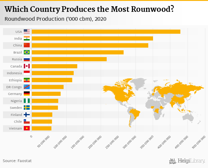 Based on a comparison of 169 countries in 2020, USA ranked the highest in roundwood production with 429,700,023 '000 cbm followed by India and China. On the other end of the scale was Iceland with 2,000 '000 cbm, Mauritius with 4,997 '000 cbm and Qatar with 5,112 '000 cbm.