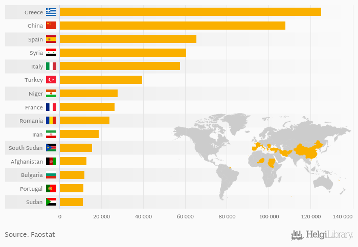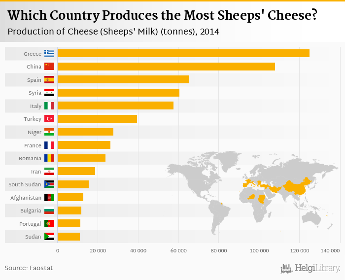 Based on a comparison of 38 countries in 2014, Greece ranked the highest in production of cheese (sheeps' milk with 125,000 tonnes followed by China and Spain. On the other end of the scale was Poland with 44.0 tonnes, Czech Republic with 52.0 tonnes and Hungary with 86.0 tonnes.