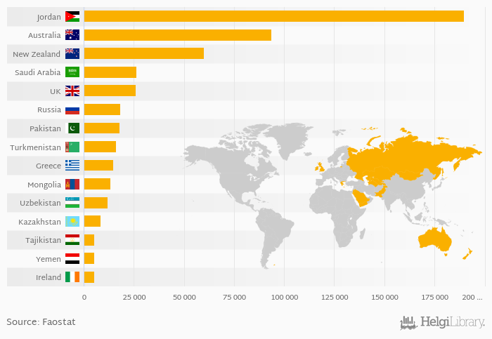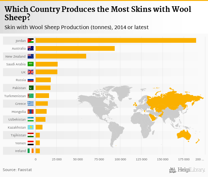 Based on a comparison of 52 countries in 2014, Jordan ranked the highest in skin with wool sheep production with 189,776 tonnes followed by Australia and New Zealand. On the other end of the scale was Philippines with 16.2 tonnes, Malaysia with 54.0 tonnes and Bosnia and Herzegovina with 94.0 tonnes.