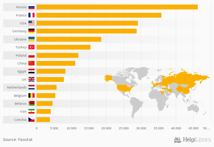 The top ranked country, Russia, accounted for 16.9 % of sugar beet production in the world. The top 3 countries hold a 40.6 % share while the ten largest countries some 77.9 % in 2014.